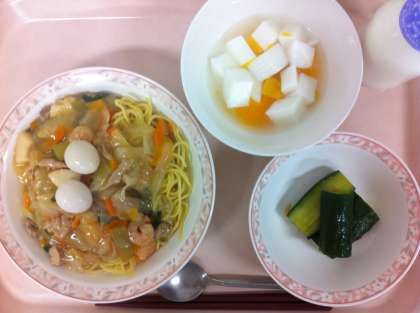 今日の五目あんかけ焼きそばは、いかやえびの魚介や野菜のたっぷり入ったあんを、中華麺にかけて食べました。麺は、蒸し中華麺を使い、麺全体に油をまぶしてオーブンで蒸し焼きにしています。うずらたまごは、1人2個づけでした。