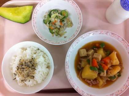 今日は、じゃがいものたくさん入った肉じゃがでした。駒込中の肉じゃがは、おつゆまでおいしく食べてもらえるよう、高野豆腐が入っているのが特徴です。大きな釜で作るので、じゃがいもが崩れないように丁寧に混ぜながら作りました。