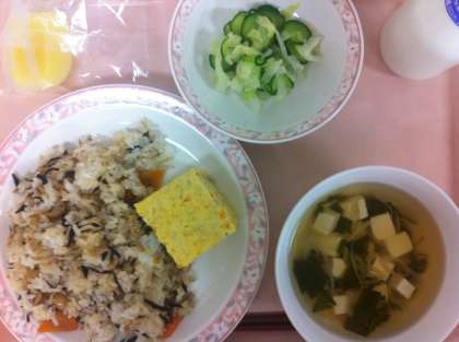 今日は、ひじきの入ったお寿司を作りました。最近、蒸し暑い日が続き食欲が低下してきているため、お酢を少し増やし、さっぱりとした味に仕上げました。具は、ひじき、にんじん、揚げ、大豆、ごま、じゃこが入り、別に煮て酢飯に混ぜ込んでいます。
