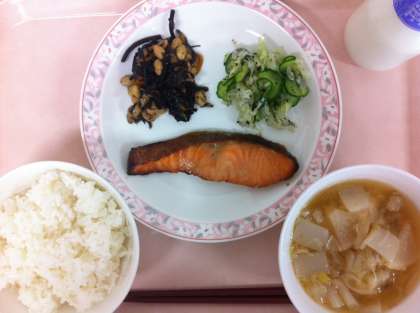 今日は、和食のメニューでした。鮭は赤味噌、しょうゆ、みりん、酒、砂糖の下味をつけてオーブンで焼いています。今日はとても暑かったので、みなさん食欲が低下しているようでした。しかし、1年生は夏バテ知らずなのか、いつも通りよく食べてくれました。