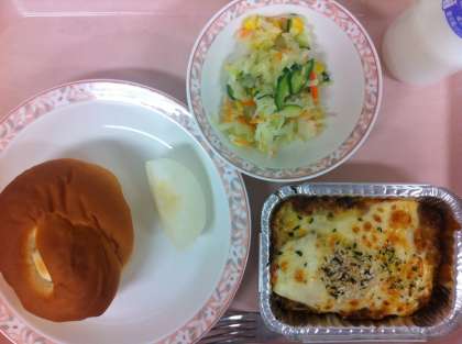 今日の「ラザニア風グラタン」は初メニューでした。みじんにしたにんにく、玉ねぎ、にんじん、豚ひきを炒めトマト缶やケチャップ、塩胡椒で調味し、トマトソースをつくります。ラザニアは本来平たいシート状のマカロニを使いますが、今日はリボン状のマカロニを塩ゆでし、トマトソースに混ぜました。別にホワイトソースを作り、トマトソース、ホワイトソース、ピザチーズの順にのせオーブンで焼きました。見た目もおいしく見えるよう焦げ目をつけ、パセリをのせて仕上げました。