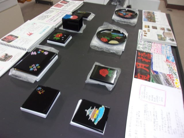 9月に行われた修学旅行では、一人一人がスケッチブックに事前学習や当日のしおり、そして事後学習などを一冊にまとめました。自分だけの修学旅行の思い出が詰まっています。また、修学旅行二日目に体験した加飾漆器が完成し、学校に届きました。スケッチブックと漆器を展示しています。