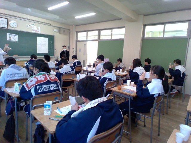 11月21日(金)1年生を対象に東京都歯科衛生士による歯みがき指導を行いました。染め出し行い、磨き残しやすいところを鏡を見ながら確認しました。歯科校医の中島先生も立会いアドバイスしていただきました。生徒は、「染め出しをしたところが、歯みがきをすることで、どんどんきれいになっていって、とても嬉しかった。家でも教えてもらった磨き方をしてみたい」や「将来、病気にならないように歯みがきをしていきたい」と感想を教えてくれました。ぜひ、今日の夜から実践していきましょう。