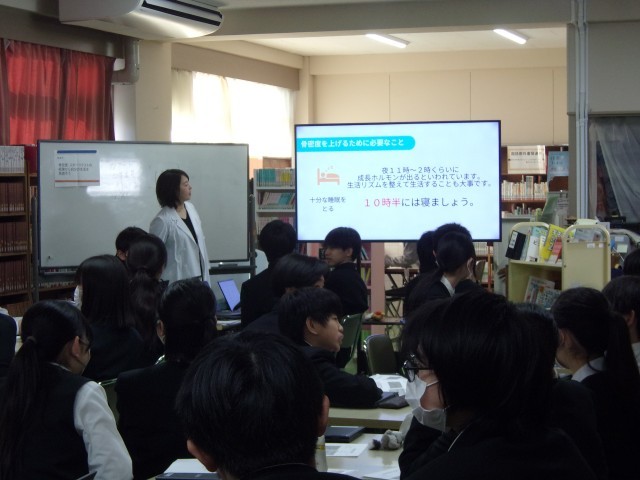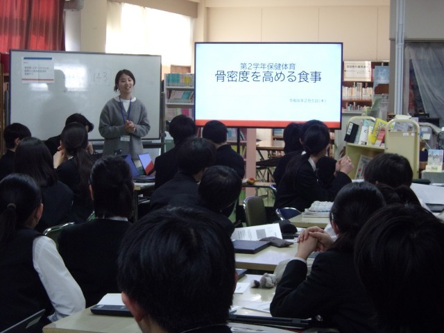 2月5日(木)2年生保健体育の授業では、骨密度検査の結果をもとに、養護教諭と栄養士が体育科の教員とともに授業を行いました。丈夫な骨をつくるには何が大切かを自分の生活を振り返りながら学びました。