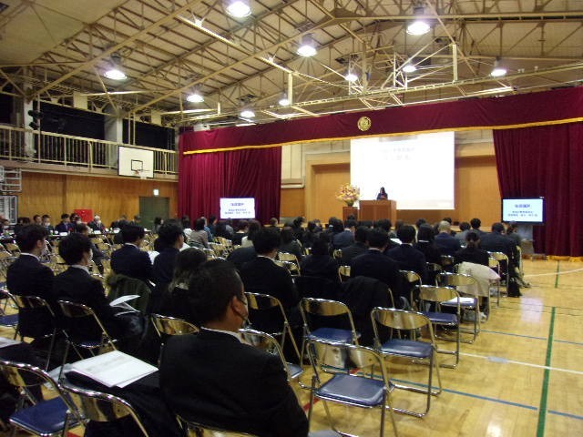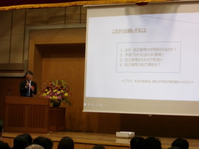 研究発表会はで、まず、生徒による発表を行いました。この発表は、「生徒の生の声を聴いてもらいたい」という教員の呼びかけに対し、「ぜひやりたい」と手を挙げてくれた1,2年生16名のプロジェクトチームによるものです。当日は、その代表として5名の生徒が登壇しました。発表で使用したスライドや原稿は、生徒たちが話し合いを重ね、役割分担をしながら作り上げたものです。生徒たちは緊張しながらも、堂々と発表してくれました。次に、教員による発表では、具体的な実践や生徒の変容をとらえた分析を発表しました。法政大学  教職課程センター長 キャリアデザイン学部 教授 児美川孝一郎先生の講演では、「なぜ自己表現力が求められるのか」という切り口から自己表現力を育むためには学校の教育活動すべてを「(内在的に)表現が立ち上がる」場にしていくことの大切さを教えていただきました。