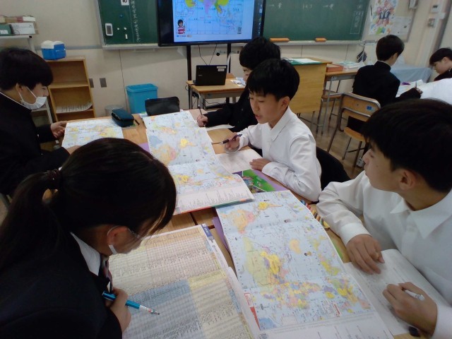 1年生の社会の授業です。「世界にはどのような国があり、どんな特徴があるか」という学習課題を解決するために、地図帳を活用し、友達と一緒に話し合いをしながら一生懸命に取り組んでいました。