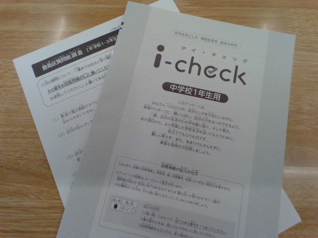 全校生徒を対象に「i-check(アイ・チェック)」を行いました。このアンケートは、生徒一人ひとりが自分らしさを大切にしながら、学習や行事、部活動などに取り組めているかを振り返るためのものです。中学校生活が始まってしばらく経ち、自分自身の生活などを見つめ直すきっかけになりました。