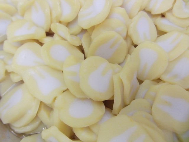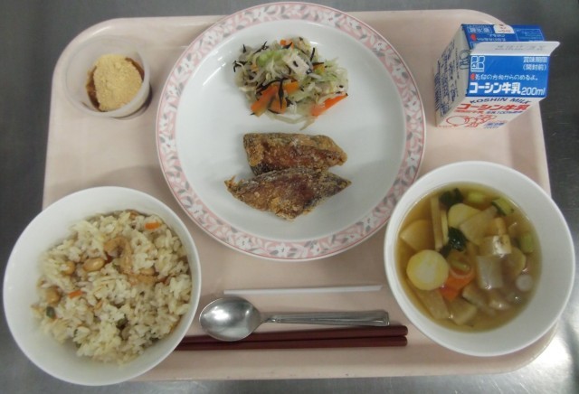 本日の給食には「黒蜜きなこ白玉」を付けました。また、けんちん汁には、「お月見かまぼこ」が入っています。