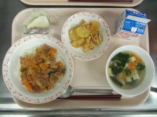 豚キムチ丼、野菜チップともに、生徒たちに人気のメニューです。どのクラスもよく食べていて、残食率は3%以下でした。