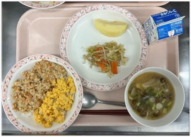 鶏そぼろは、鶏ひき肉のほかに、豆腐、切り干し大根を加えました。豆腐や切り干し大根を入れることでカルシウムがアップします。
