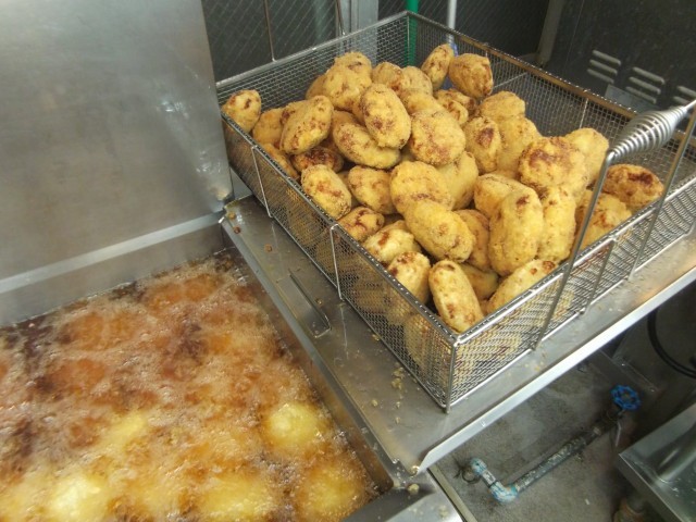 コロッケは、駒中給食室特製のコロッケです。じゃがいも、ひき肉、玉ねぎ、大豆を合わせて作ります。隠し味に「ナツメグ」が入っています。