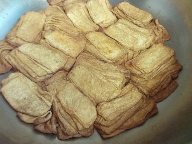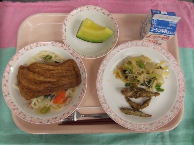 うどんは、1・2年生のリクエスト献立3位のメニューです。また、給食アンケートで、「きつねうどん」のリクエストがあったので、取り入れました。大きな油揚げは、全部で約190枚、大きな鍋で1時間じっくり煮込み、味をしみ込ませました。