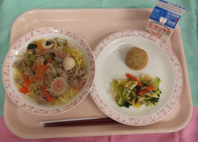 給食アンケート「こんな給食あったらいいな」で募集したメニュー「しょうゆラーメン」を取り入れました。なると、うずら卵、小松菜、人参、もやしが入った具だくさんのラーメンです。