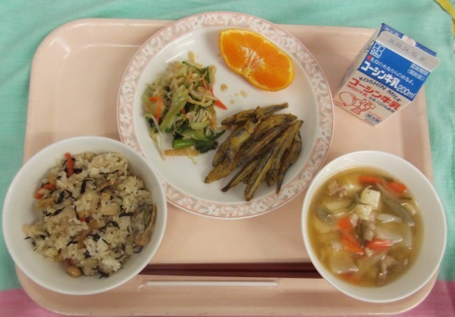 噛み応えのある食品を取り入れた「カミカミ献立」です。本日の献立では、きびなご、サラダに入っているさきいか、豚汁に入っている茎わかめ、ごぼう、にんじんが噛み応えのある食品です。よく噛んで食べ、健康な歯を保ちましょう。
