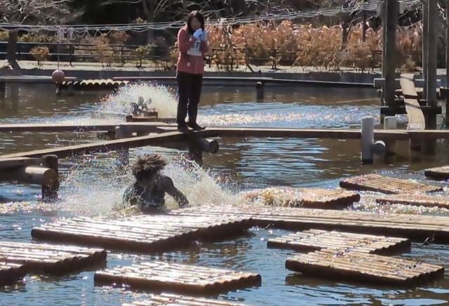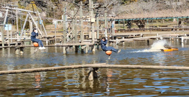 水上コースでは、ずぶ濡れになる生徒も…。アスレチックのあとは、シャワーで体を温めました。