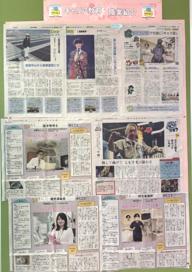進路係が「おしごと」をテーマとした新聞記事をパネルにレイアウトしました。