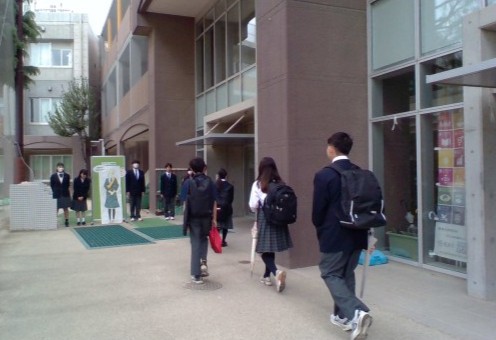 朝の昇降口では、挨拶活動が行われています。