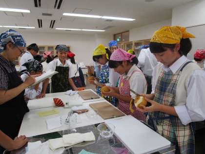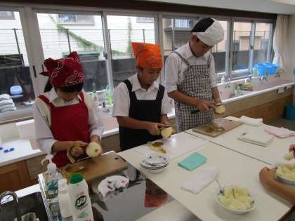 本日、2年1組でなしの皮むきの調理実習がありました。