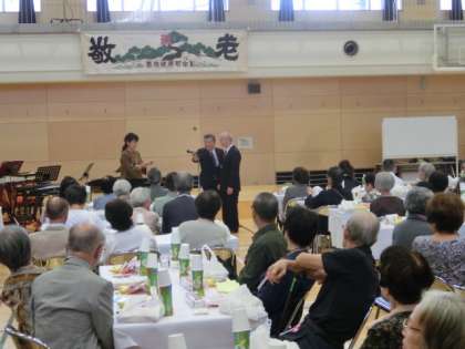 特別支援学級の生徒が作成した「しおり」が、記念品として敬老会代表の岸野副会長に手渡されました。