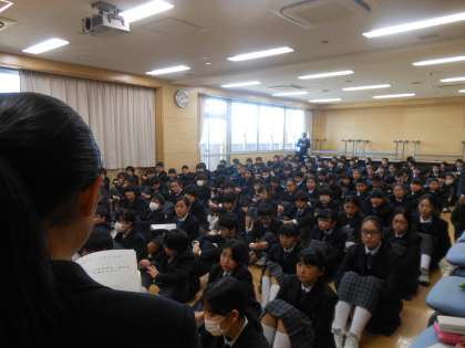 24日までのスキー教室を終えて、昨日は振替休日。今日26日は、ほぼ疲れを引きずることなく登校し、各係ごとに反省点を話し合い、学年集会を行いました。