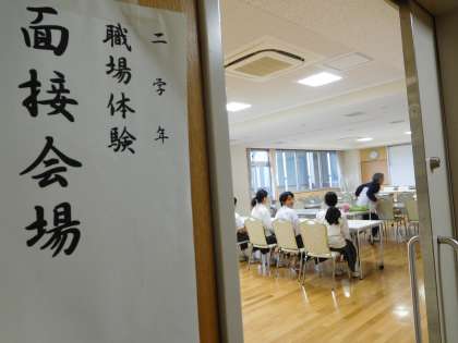 職場体験に向けた職場の「求人票」を見て期日までに「希望票」を提出した人から、面接を始めました。8人が緊張の面持ちで面接に臨みました。しっかりと言葉を選びながら、自身について、志望動機、意欲などを堂々と語ることができました。来週も放課後の時間は面接が続きます。