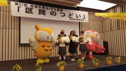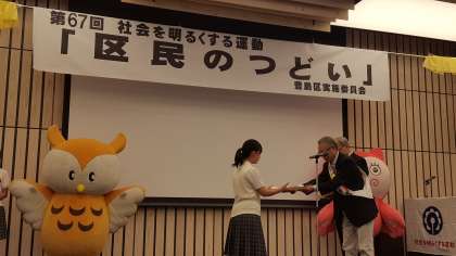 第一部のセレモニーでは、作文コンテストの表彰がありました。小中学校2000以上の作品の中から、西池袋中学校の生徒の2作品か、優秀賞に輝きました。