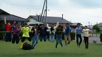 各班、体験を終えて集合場所に戻って来ました。天気は、曇っていますが、まだ雨は降っていません。この後、昼食場所の原田農園に向かいます。