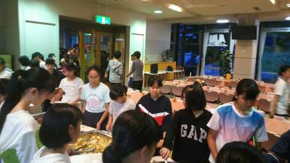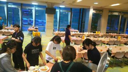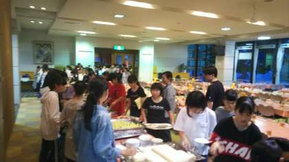 夕食の時間になりました。宿舎での食事は全てバイキング。たくさん歩いた分、しっかりと栄養をとりましょう!