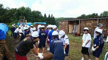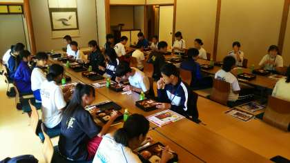 今日は能代市の中学生との交流がメインになりました。午前中は薪割り体験等を行い、由緒正しい元料亭「金勇」で昼食。午後は、JAXAと能代工業高校バスケ部を見学した後、班毎に分かれて市内を散策しました。