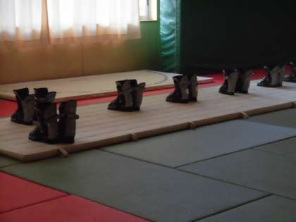武道場に置かれたスキー用品。実際に着用してサイズ確認をするために並べられています。