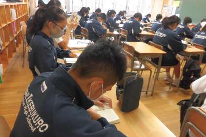 写真1:テントの作業。写真2:米の収穫が各地で始まり、給食のお米は新米に切り替わり、掲示板には稲穂が展示されています。写真3:朝読書の様子。
