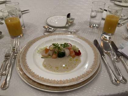 前菜、スープ、パン、お魚はサーモン、お肉は鶏、料理の名前は長すぎるので省略!