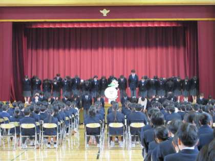 対面式の後半は、部活動紹介がありました。各部の部長がインタビューに答える形で、自分の部を紹介していきます。最後には、にしまるも来てくれました。
