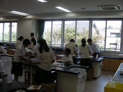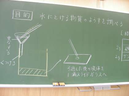 さて、1時間目の、1年生理科の授業です。理科室での実験は「水に溶ける物質」の様子を調べる授業です。各班ごとに、砂糖とでんぷんを水に溶かして、様子を調べます。