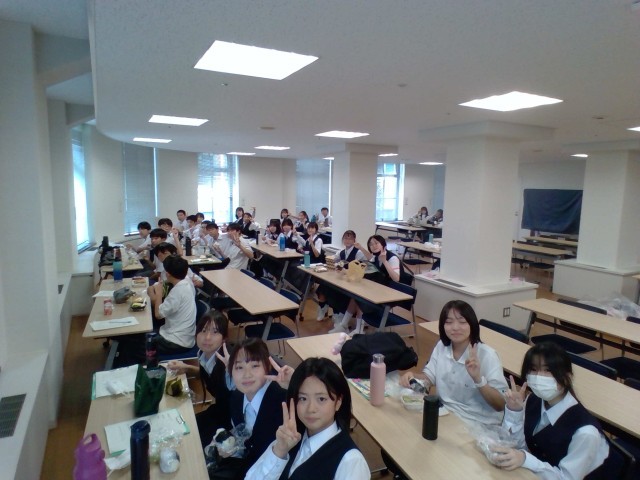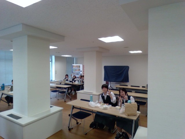 1組の昼食の様子です。このあとにみなとみらい館へ移動します。