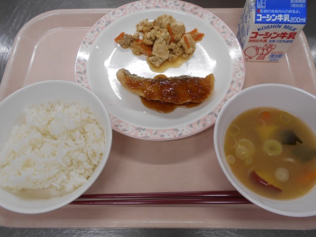 炒り豆腐は、低カロリーな豆腐を野菜と卵と一緒に炒め、ご飯がすすむ味つけにしました。おみそ汁には、さつまいもが入っています。さつまいもは、英語で「スイートポテト」と言うように、芋類の中でも甘みがあるのが特徴です。栄養面では、みかんと同じ位ビタミンCが含まれていて、加熱しても壊れにくいです。