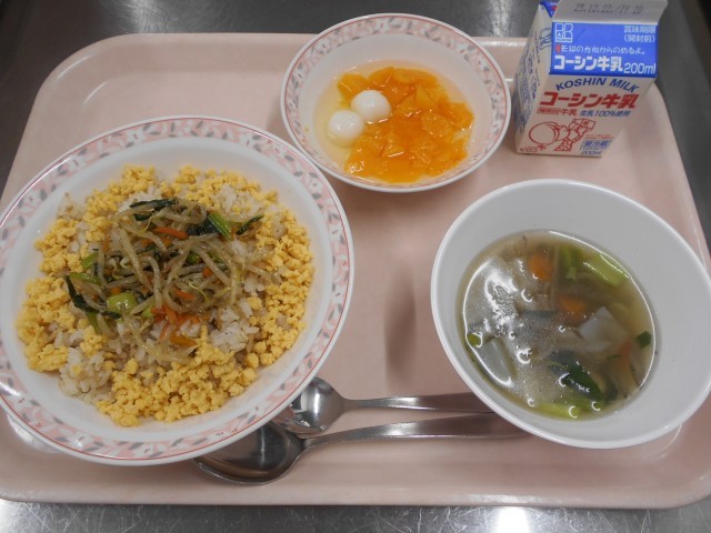 三色丼は、鶏そぼろ、炒り卵、野菜、ごはんがバランスよく入っています。炒り卵は、全校で22㎏、300個以上の卵を割り、溶きほぐしてから、大きな釜に入れて、大きな泡だて器で20分程かき混ぜて作ります。お家では、簡単な料理も550人分だと体力勝負ですね。