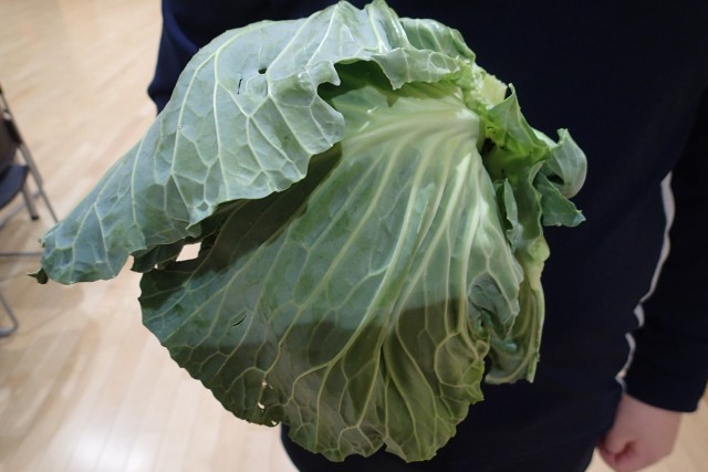 「校長先生、キャベツができました。」元気のよい声と共に生徒が見せに来てくれました。「どれどれ、重くて、大きくて、よく結球していて立派です。やりましたね。」「結球って何ですか。」「結球とは葉が球になることです。」「へえ、そうなんですね。結球かあ。」この後、6組生徒はキャベツを千切りにしました。再び持ってきてくれ、私もドレッシングをかけておいしくいただきました。本校の屋上庭園では、夏の野菜に引き続き冬の野菜を栽培しています。夏場のキュウリも100本以上収穫できました。都心であるものの、条件がそろえば立派な野菜を栽培することができます。
