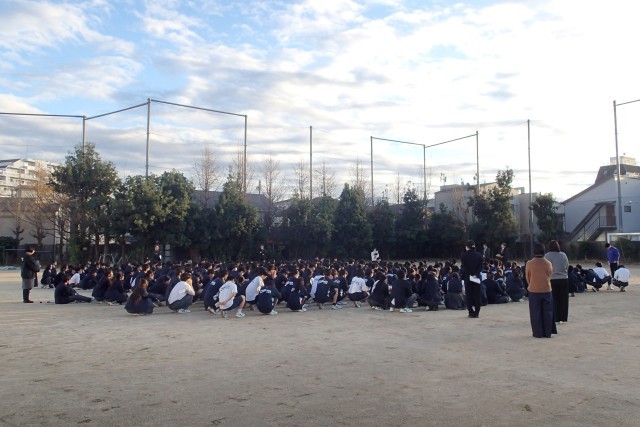 地震発生直後に、火災が発生したことを想定し校庭へ避難しました。教職員は、生徒、教職員の避難経路を確認すること。誘導体制を確立することの2つをねらいとしています。生徒は自ら考えて行動すること。とるべき行動を果たすこと。協力して避難することの3つをねらいとしています。500名もの生徒は数分間で校庭に避難しました。「おさない かけない しゃべらない もどらない」は避難の基本です。取り組むごとに生徒の意識が向上していることがわかります。