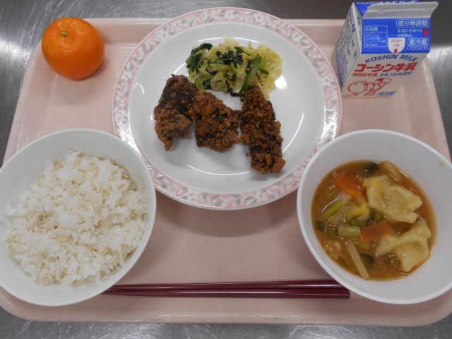 1月24日から30日は、「全国学校給食週間」です。巣鴨北中は行事と重なるため、今日から学校給食週間の献立にしました。昭和20年代から40年代にかけて、鯨は安かったため貴重なたんぱく源として給食に登場していました。しかし、昭和45年頃から商業捕鯨が制限され鯨の値段が上がったため昭和50年頃には給食から姿を消しました。鯨の定番料理の竜田揚げです。