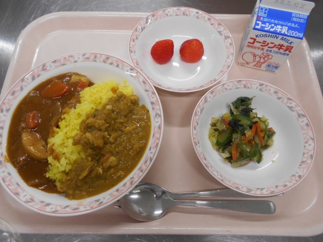 1月22日がカレーの日になったのは、1982年のこの日に学校給食創立35周年を記念して、学校給食を管理している全国学校栄養士協議会が全国の小中学校にカレーライスを給食として出したことがカレーの日となった由来になっています。今日は、カレー味のごはんに小松菜とレンズ豆のカレー・東京Xカレーの2種類のカレーでトリプルカレーです。東京Xは、おいしい肉質をかけあわせてできたという意味でXの名前についた東京産の豚肉です!小松菜も東京産で地産地消でした。