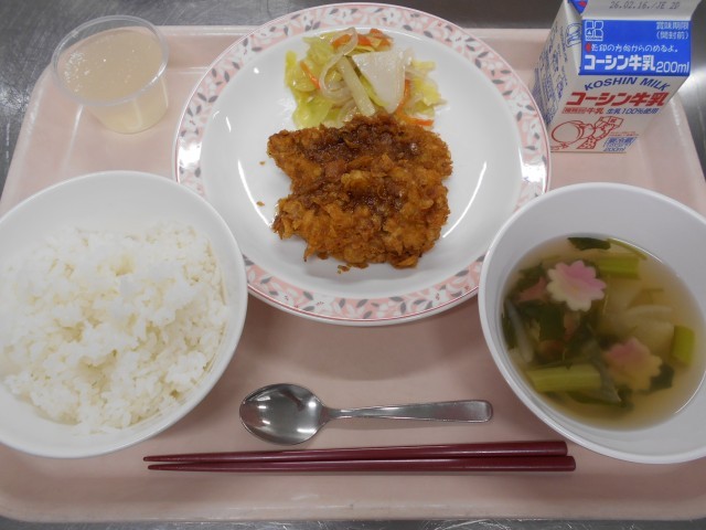 今日は3年生の受験を応援するための献立です。3年生のアンケートで2学期最後に提供したチキンのフレーク揚げがまた食べたいという意見があったので、豚のヒレ肉でフレーク揚げを作りました。応援する想いをこめてフレーフレークカツです!合格サラダは、ごぼう、うど、かまぼこ、くずきりが入ったサラダでそれぞれの食材の頭文字をとって合格サラダです。すまし汁は桜麩をいれました。「サクラサク」という言い回しが、合格することを意味して使われます。レモンスカッシュゼリーの味はさっぱりでストレスで消耗しやすきビタミンCが入っています♪