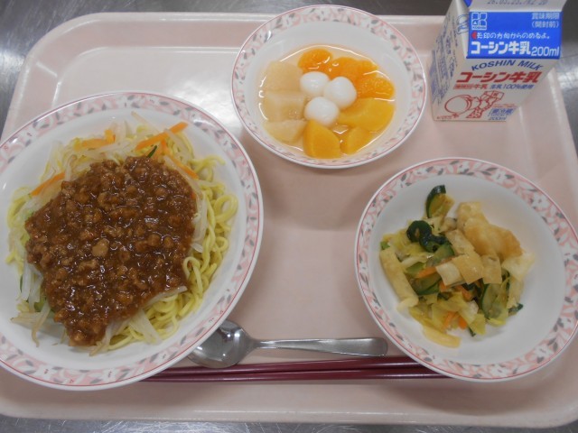 ジャージャー麺は、3年生のアンケート主食部門の1位、パリパリサラダは副菜・汁もの部門の1位、白玉フルーツポンチは、デザート部門の3位でした!