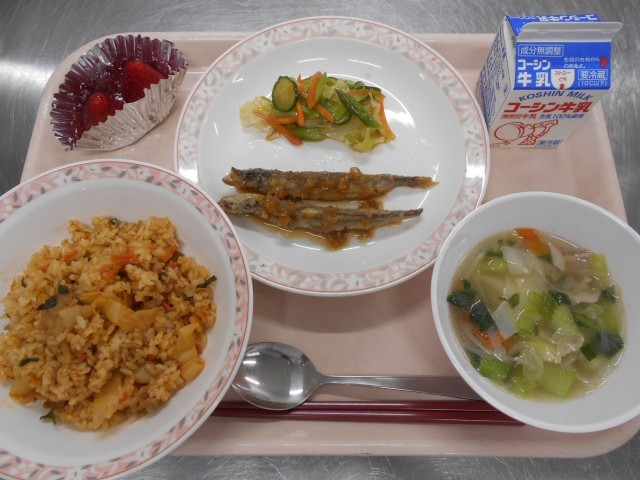 ししゃも、しらすなどの小魚は、骨ごと食べることができるので、骨や歯をつくるカルシウムをたくさんとることができます。カルシウムは、ビタミンD を一 緒にとると吸収されやすくなります。ビタミンDは、魚の内臓や皮にたくさん含まれています。魚を丸ごと全部食べることで、効率よくカルシウムが吸収されてじょうぶな骨や歯をつくることができます。 また、よくかむことで脳の働きをよくしたり、虫歯の予防にもなります。 今日はししゃものねぎソースにしました。頭からしっぽまで丸ごと食べて、ししゃもの栄養を残さずいただきましょう。