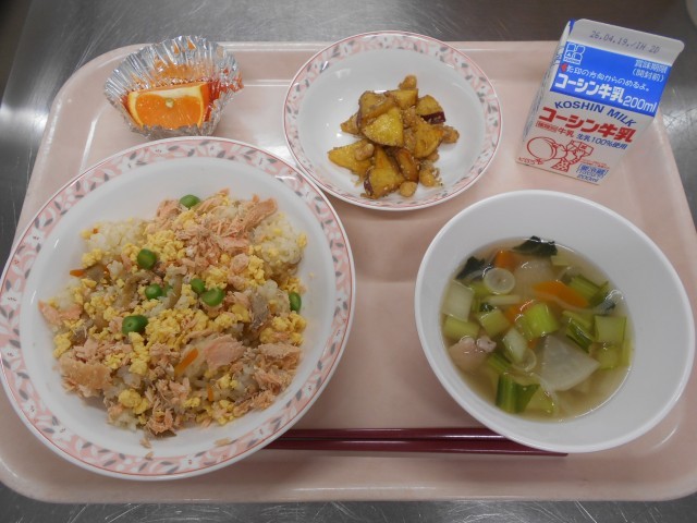 春のちらしずしは、鮭や卵・いんげんを散らして春の色とりどりの花を表しています。1年生の入学祝いと2・3年生の進級をお祝いした献立です。鮭は身が綺麗な紅色ですが、実は白身魚です。鮭の餌となるエビなどの色素により、身の色が赤くなります。また、沢煮椀とは,豚肉や鶏肉とせん切りにした野菜で作った汁物です。 果物のセミノールは、ダンカングレープフルーツとダンシータンゼリンという2種類の柑橘を後輩させて誕生した品種です。