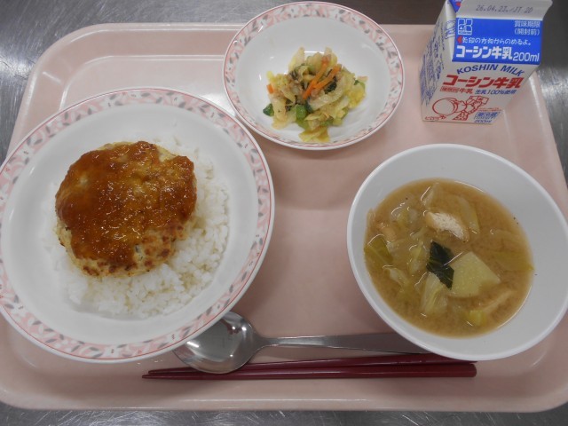 つくねは、手でこねて形を作る・手でこねて丸くするという意味をもつ言葉の「捏ねる(つくねる)」が語源とされています。今日は鶏肉に野菜や豆腐、調味料などをよく混ぜ合わせて作りました。れんこんを入れてシャキシャキ感を出しました。ごはんの上にのせて食べましょう!みそ汁は、新じゃが、新たまねぎ、春キャベツの春野菜が入っています。甘味が強く、やわらかい食感が特徴です。味わっていただきましょう。