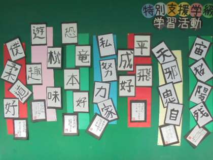 職員室横の掲示板には5組の書写の作品がとてもきれいに掲示されていますのでご紹介します。色使いがきれいで文字がとてもよい雰囲気を創り出しています。