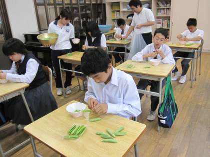 今日は、今の時期が旬のグリンピースを使ったごはんでした。6組のみんなが1時間目に全校分の量を一粒一粒丁寧に取り出してくれました。どのクラスも6組のみんなに感謝しながら食べていました。グリンピースが苦手な生徒もいますが、旬の食材の味を感じてほしいと思います。