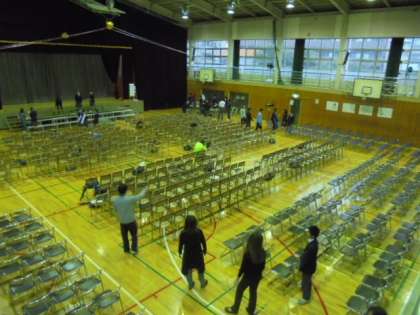10月28日(金)明日はいよいよれんが祭です。生徒は給食後、体育館に自分のいすを運び、全体学活で明日の注意事項を聞きました。その後、実行委員や専門委員会ごとに会場準備をしました。この体育館で行う最後のれんが祭です。最高の合唱、最高の演技が披露できるよう、頑張りましょう。