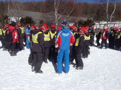 1月26日(木)カレーライスの昼食を食べて、ゲレンデに戻り午後の講習が始まりました。上手になってきたため、早く滑り出したい人がたくさんいます。2時間半しっかり練習しましょう。